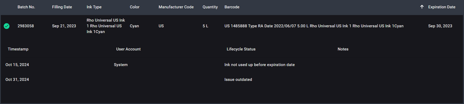 | Expiration Date | Expiration date of the ink, expired ink shouldn't be used in machines |