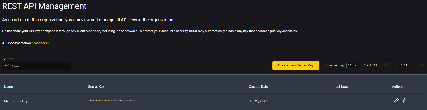 - View existing keys, including creation and last usage dates