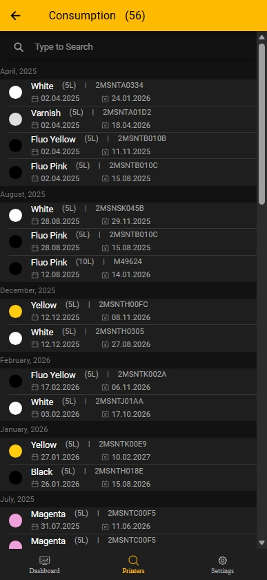 The Consumption section lists ink and varnish entries, including quantity, lot or batch information, and relevant date details.