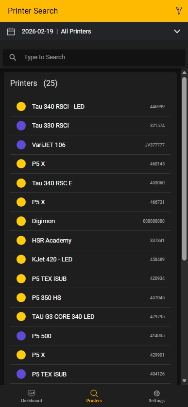 After selecting a printer, the header card displays key machine identifiers and the current status.
